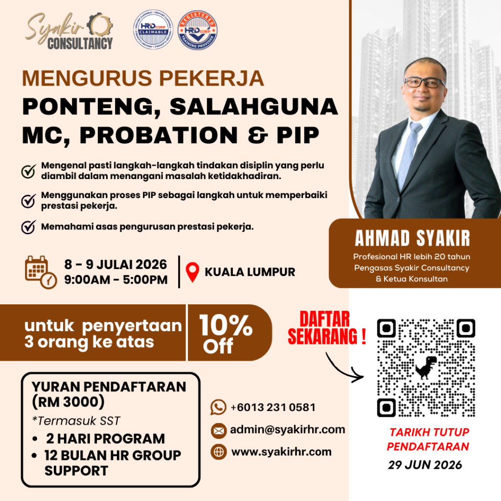 Di samping itu, pengurusan prestasi pekerja, terutamanya bagi mereka yang berada dalam tempoh percubaan atau yang tidak menunjukkan prestasi memuaskan, adalah aspek penting yang perlu diberi perhatian. Pengurusan prestasi yang berkesan memerlukan penetapan matlamat yang jelas, maklum balas yang berterusan, dan penilaian kemajuan secara berkala. Proses ini harus adil, telus, dan berlandaskan kriteria objektif. Sekiranya pekerja gagal mencapai prestasi yang diharapkan, langkah seterusnya mungkin membawa kepada penamatan perkhidmatan. Kursus ini akan membincangkan langkah-langkah berkesan untuk menangani pekerja yang ponteng, menyalahgunakan sijil sakit, serta pekerja yang tidak berprestasi, sambil memberikan pendedahan terhadap peruntukan undang-undang yang relevan.